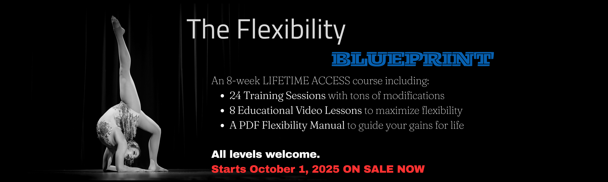 October 1-November 19 8 Week Flexibility Intensive Series The Flexibility Blueprint LIVE Wednesdays 6-7pm plus two additional recorded workouts per week (24 total workouts plus additional educational videos)